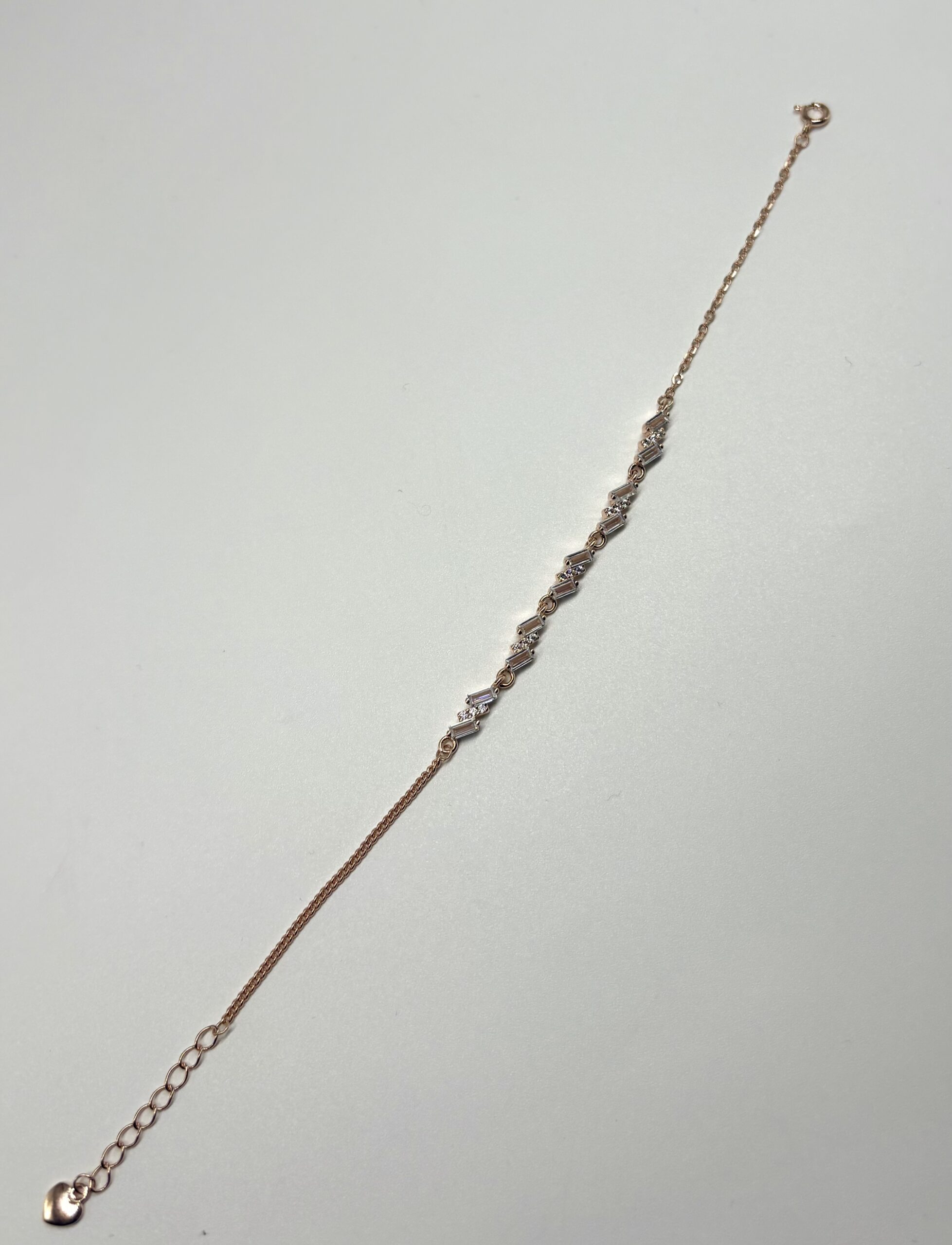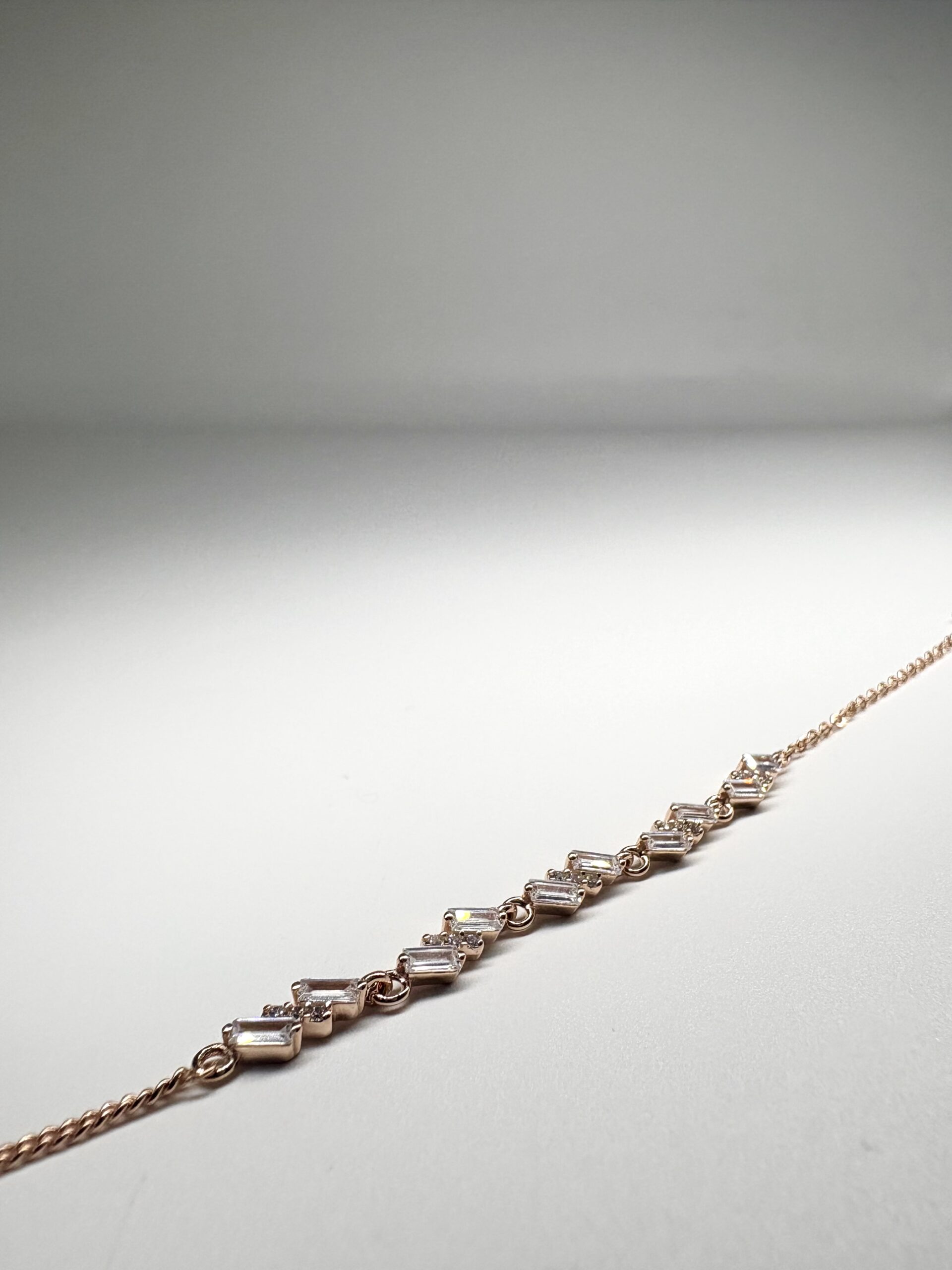 Minimalist, modern, and effortlessly stylish – this Baguette Stone Bracelet is crafted in sterling silver with a warm rose gold finish. The neatly aligned baguette-cut stones add just the right amount of sparkle, making it a timeless addition to your jewellery collection. Lightweight yet luxurious, it’s designed to complement every outfit, every day.