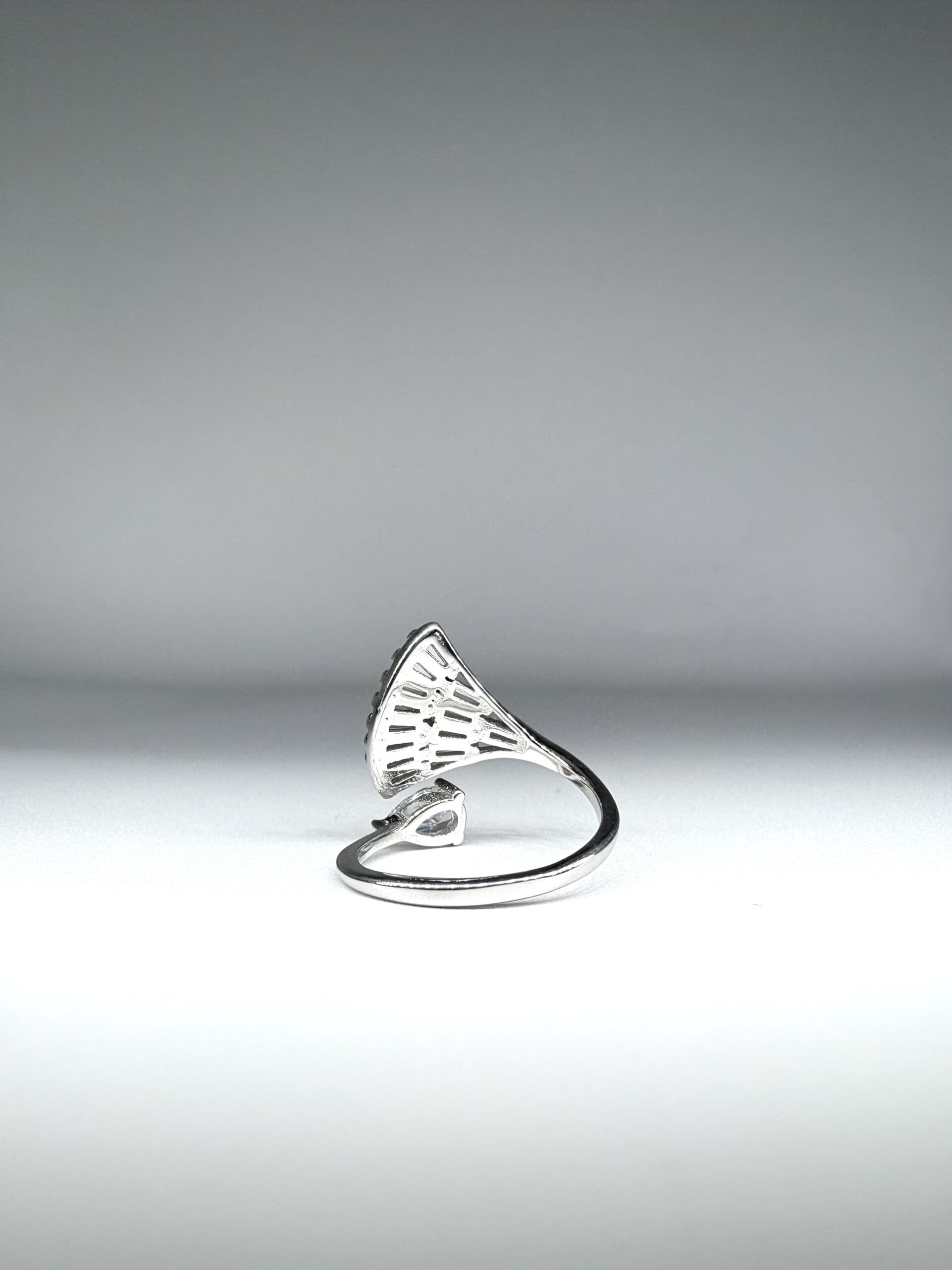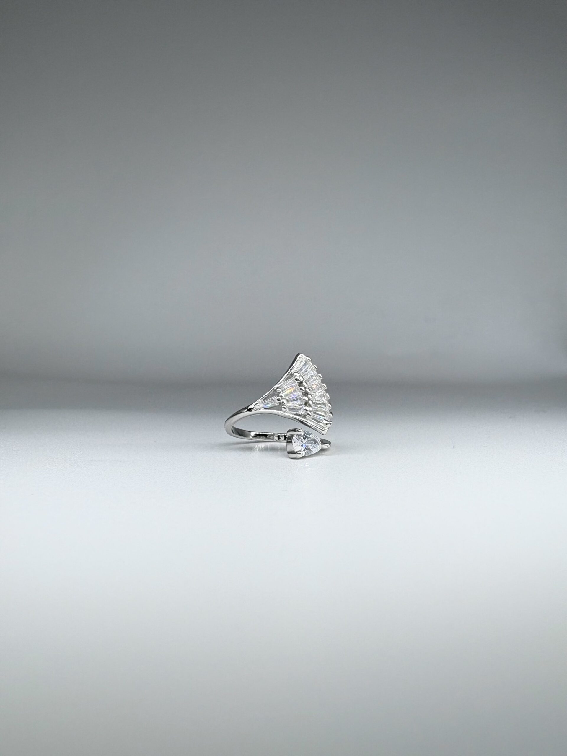 Design: Open ring with a pear-cut zircon on one side and a fan-shaped baguette motif on the other